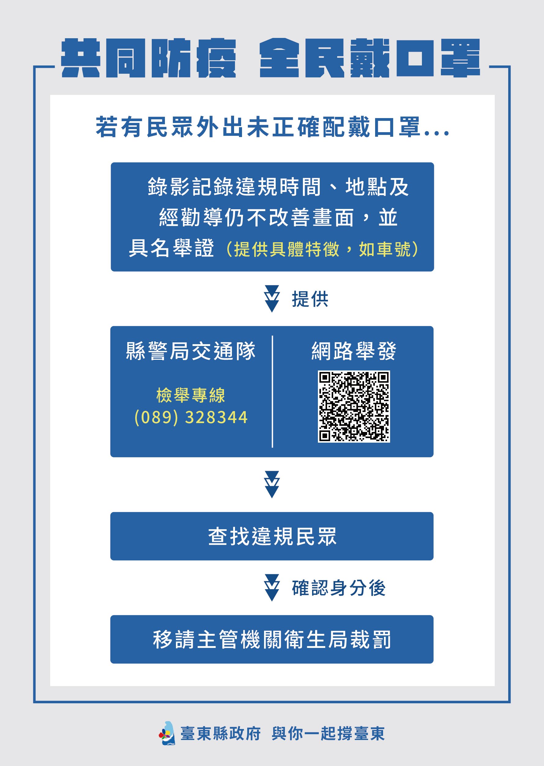 全國三級警戒,大家一定要用最高規格防疫,才能讓疫情早日退散!台東縣縣長饒慶鈴宣布,外出「不戴口罩就開罰」,若發現違規又勸不聽,請民眾以手機或其他工具錄下違規時間、地點及勸導仍不改善的影音,並附上可辨識身分的具體特徵(如車號),以具名向縣警局交通隊提出檢舉,找出確實違規者以利後續裁罰。