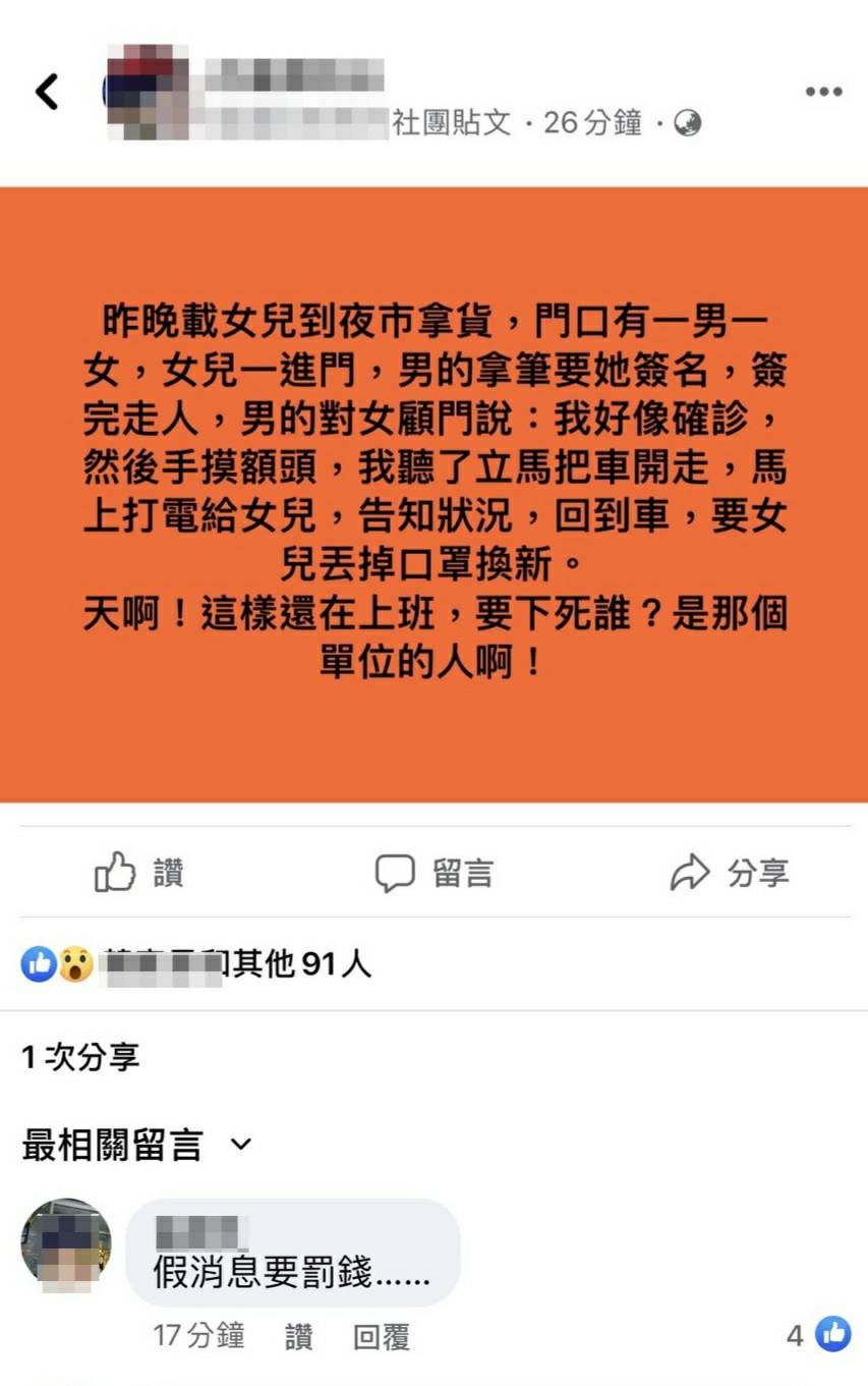 夜市為國人生活中最具代表性的飲食文化,與日常生活息息相關,一名吳姓婦人26日在花蓮知名臉書社群上,寫下與家人前往某夜市時遇上一男一女管制員工,其中男子在要求留下實名資料後,突然表示自己好像確診,讓吳女飽受驚嚇等話語°