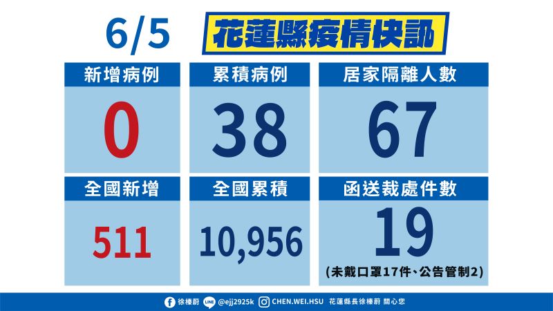 花蓮縣今天迎來自上個月22號以來第一個零確診日,花蓮縣防疫指揮中心下午召開記者會表示,目前仍有67人列管隔離,雖然今日零確診,呼籲縣民做好個人居家防疫,一同為台灣加油。