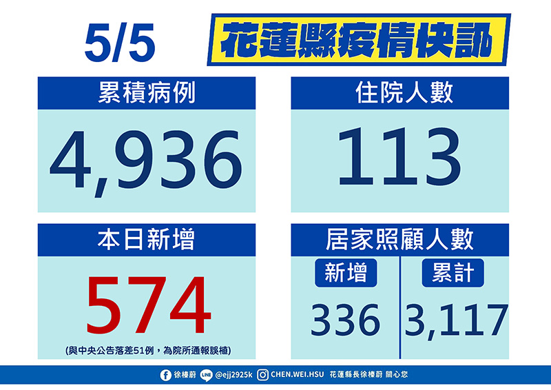 衛生局長朱家祥在疫情記者會時說明,中央公佈花蓮今天新增625例,但是其中有51例,是某醫院在PCR採檢紀錄中,應該是陰性,但被誤植為陽性,而中央疫情指揮中心未改過來,所以花蓮其實是新增574例,累計已有4936例,住院治療中113例,居家照護中累計3117例,解隔累計9710例,尚在居隔中644例;新增574例中,12歲以下86例、13-18歲38例、19-64歲373例、65歲以上77例。