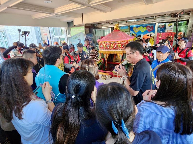 魏市長帶領公所主管及同仁虔誠向媽祖參拜,祈求市政昌隆、百姓安居樂業、闔家安康,並與民眾一同跪地鑽轎腳祈福,接著與信眾一同前往三民街承天佛具行,已有上百位信眾在此恭迎聖駕,魏嘉彥也與市民代表會主席李振瑋再次祈求媽祖福澤庇佑,其中粉紅鑾轎起駕前,更特地停下為現場的小妹妹賜福,令眾人感動不已。